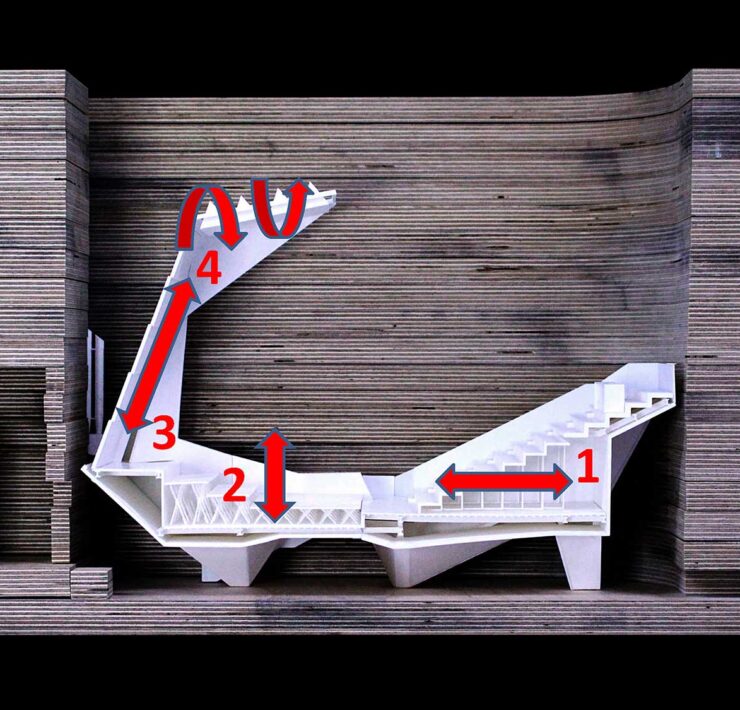 Tutte le tecnologie sceniche e acustiche sono integrate nella struttura della sala, mentre i sistemi di ventilazione e di sicurezza antincendio sono ospitati in un blocco sopra il tetto della scala principale.