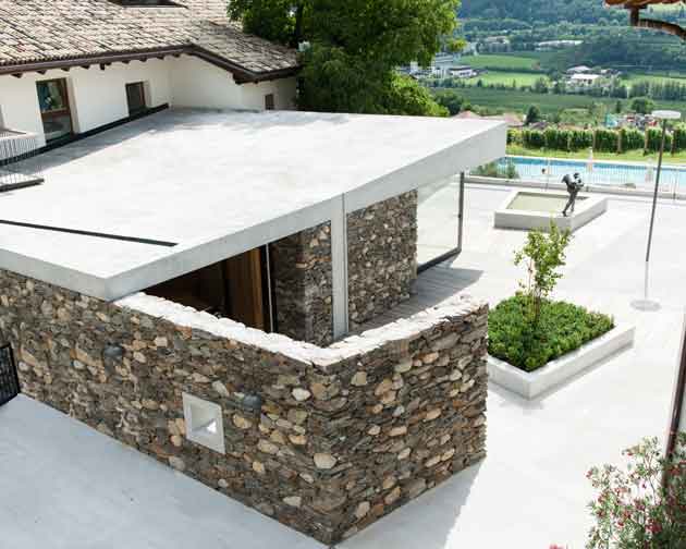 Il padiglione collegato al corpo dell’edificio è realizzato in cemento idrorepellente e caratterizzato dal forte aggetto della cornice di copertura la cui pendenza convoglia l’acqua piovana verso il canale di scolo, frattura visibile attraverso il muro esterno. Pareti vetrate a scomparsa dilatano ulteriormente gli spazi coperti verso l’esterno, mentre la pietra utilizzata per il rivestimento del padiglione e del muro di contenimento richiama concettualmente e visivamente i retrostanti terrazzamenti coltivati a vite.