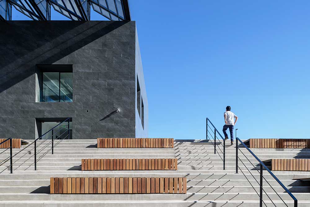 Il foyer esterno che collega fabbrica e uffici è allestito con gradinate e panche dove i dipendenti possono socializzare e godersi l’aria aperta, ©Moritz Bernoully.