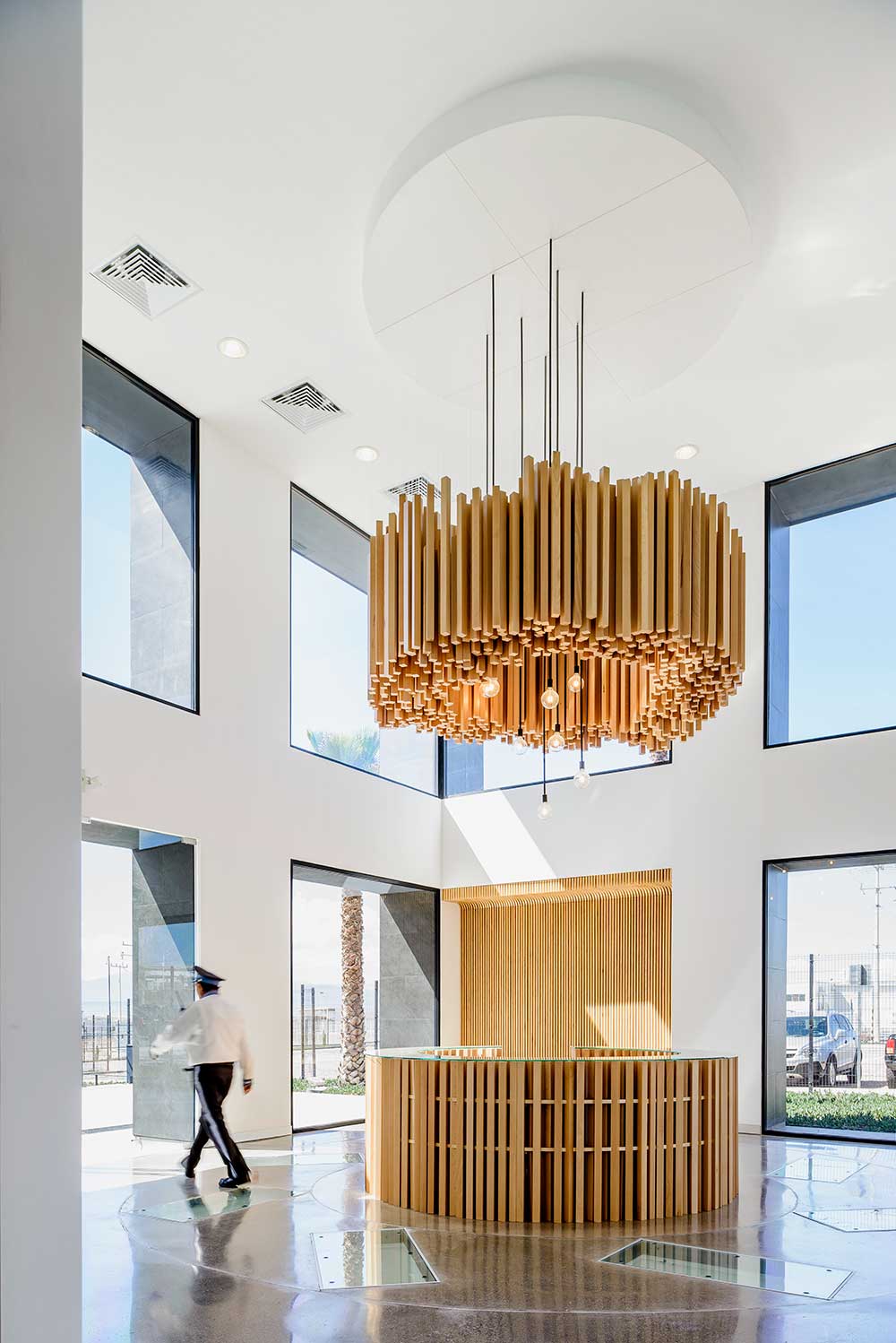 In linea con l’immagine aziendale, l’interno è semplice e pulito, con pavimenti in cemento lucido, pareti imbiancate a calce e con il maggior numero possibile di spazi aperti. Particolare enfasi è stata posta sulla progettazione degli spazi pubblici, come la lobby e la mensa, con arredi in legno su misura.