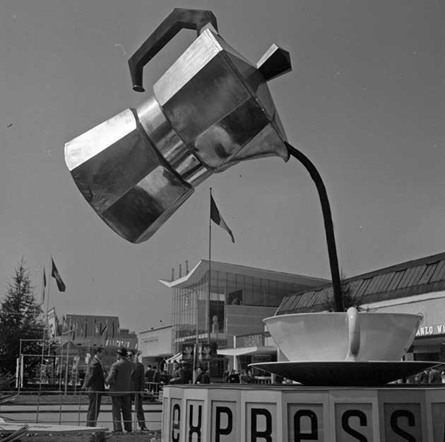 1954. Installazione pubblicitaria Bialetti alla Fiera Campionaria di Milano. |