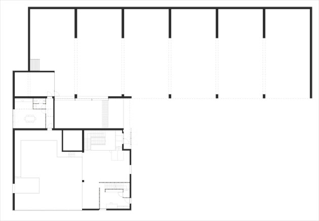 Piante, prospetti e sezione trasversale. Sono chiaramente distinguibili il corpo del magazzino, più alto e semi-interrato e a sinistra, proteso verso la strada, il corpo della centrale termica. |