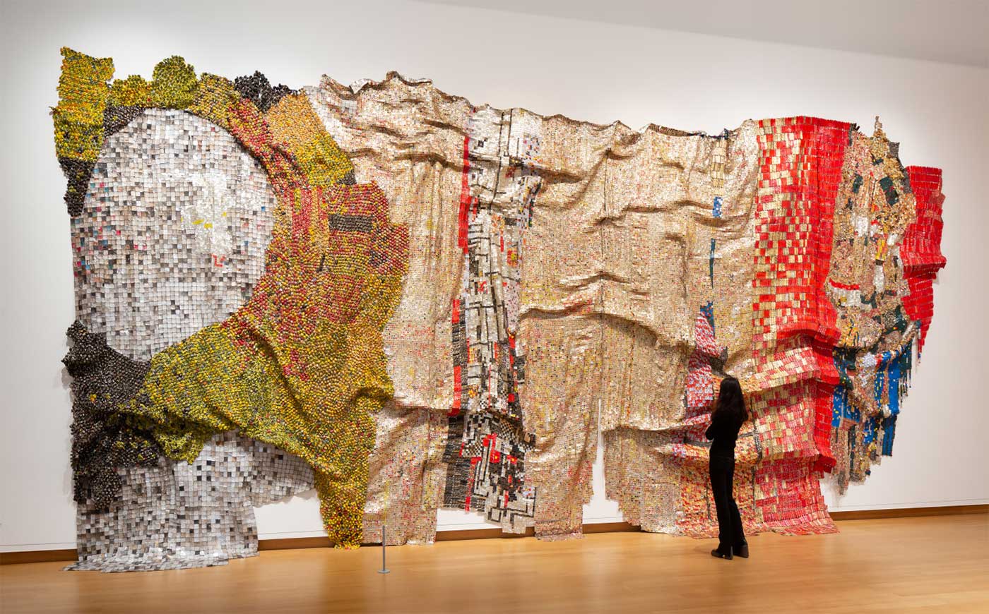 Recentemente protagonista della mostra El Anatsui. Triumphant Scalea Berna e fino al 21 febbraio 2021 al centro della mostra dello Stedelijk Museum di Amsterdam Small World Real World, la scultura, alta 560 cm per 10 metri di lunghezza, colpisce da lontano per le dimensioni monumentali e affascina da vicino per i dettagli che, ricavati da materie di riciclo e scarti di prodotti di consumo come i tappi di latta delle bottiglie di liquore, risplendono qui come gioielli, anche se il riferimento è alla storia coloniale dell’Africa e ai suoi abitanti, per secoli merce di scambio – anche con il liquore – nei mercati dello schiavismo.