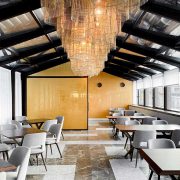 Se istintivamente si potrebbe pensare a un paesaggio grigio, queste immagini invece si distinguono per le loro cromie. Come i colori del tramonto sul municipio di Sesto San Giovanni di Piero Bottoni, originalmente pensati per evocare i colori di un altoforno. Alla Feltrinelli di Herzog & de Meuron, l’uniforme arancione dei lavavetri sospesi in alto echeggia il colore di un barboncino che corre lì davanti.