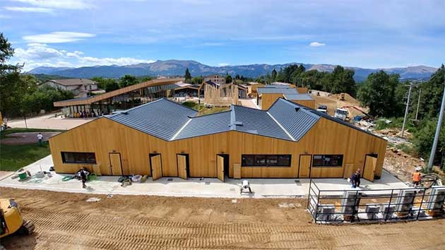 Le architetture sono realizzate con elementi prefabbricati in legno massiccio di abete per la struttura portante e con moduli di tamponamento in larice.