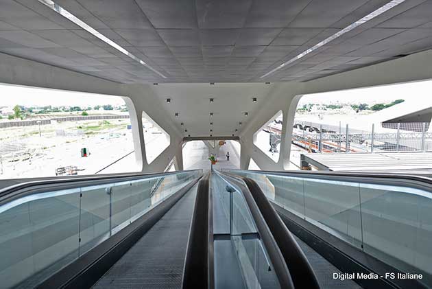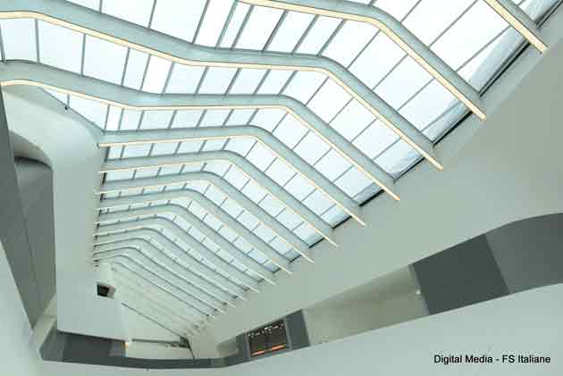 Da questo spazio, capace di orientare i visitatori tramite la connessione visiva e la percezione profonda dello spazio architettonico, si può agevolmente scendere verso le banchine d’attesa.
