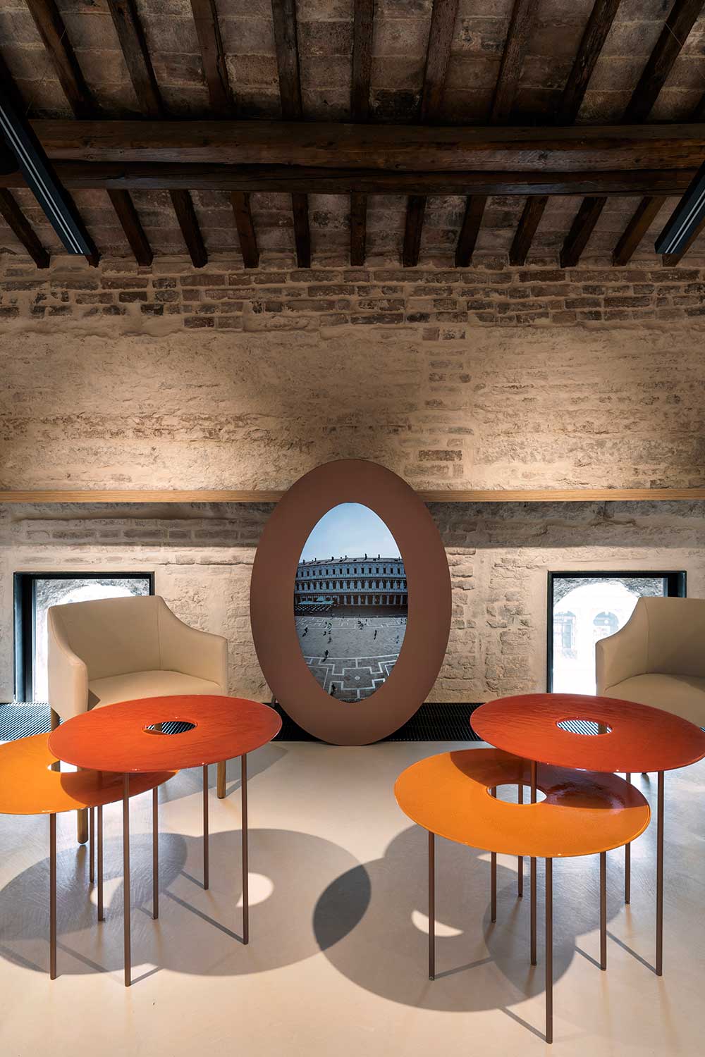 L'area caffè. Nel progetto di interni Migliore+Servetto hanno dato particolare rilievo ai 100 oculi cinquecenteschi che percorrono l'intero piano. In alcune di queste aperture la visione è stata potenziata tramite un sistema tecnologico di ingrandimento (ph. ©Andrea Martiradonna).