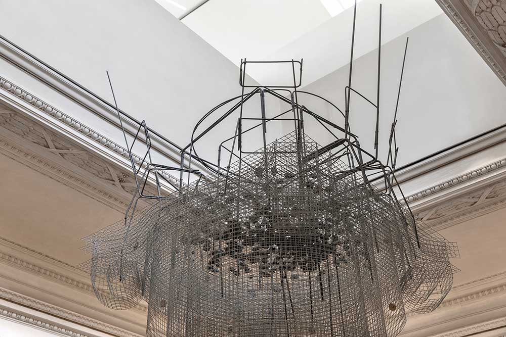 Una colonna alta più di 15 metri inrete metallica, legno, vetro frantumato, tondini in ferro e pietre è collocata nello spazio attorno al quale si sviluppa lo scalone delle Procuratie Vecchie: Monumento, l’installazione dell’artista Edoardo Tresoldi – realizzata in collaborazione con Carlotta Franco per il concept architettonico e con il supporto progettuale di Gico Studio – rielabora il linguaggio della colonna monumentale sovvertendo la tradizionale retorica del monumento: salendo la scala lo spettatore ha modo di osservarla nella sua interezza, dalla base all’estremità, in un cambio di prospettiva che innesca a sua volta un ribaltamento concettuale.