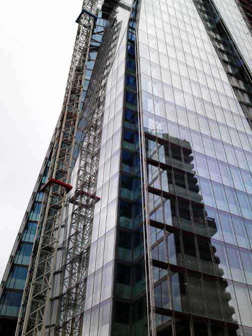 Per il rivestimento delle facciate, firmate da Permasteelisa, sono state impiegate complessivamente 10mila cellule in vetro e alluminio con schermature incorporate, per un totale di circa 20mila pannelli ognuno di dimensioni diverse. L’involucro dello Shard London Bridge ha visto l’utilizzo di alcune tra le più innovative soluzioni tecnologiche nel campo delle facciate esterne in materia di efficienza energetica: in particolare, é stata adottata la facciata ventilata con tecnologia Interactive Wall™, un brevetto Permasteelisa che, gestendo opportunamente i flussi di ventilazione naturale riduce il consumo di combustibile per il riscaldamento nei mesi invernali e rinfresca in estate, migliorando l’abitabilità interna in ogni stagione.