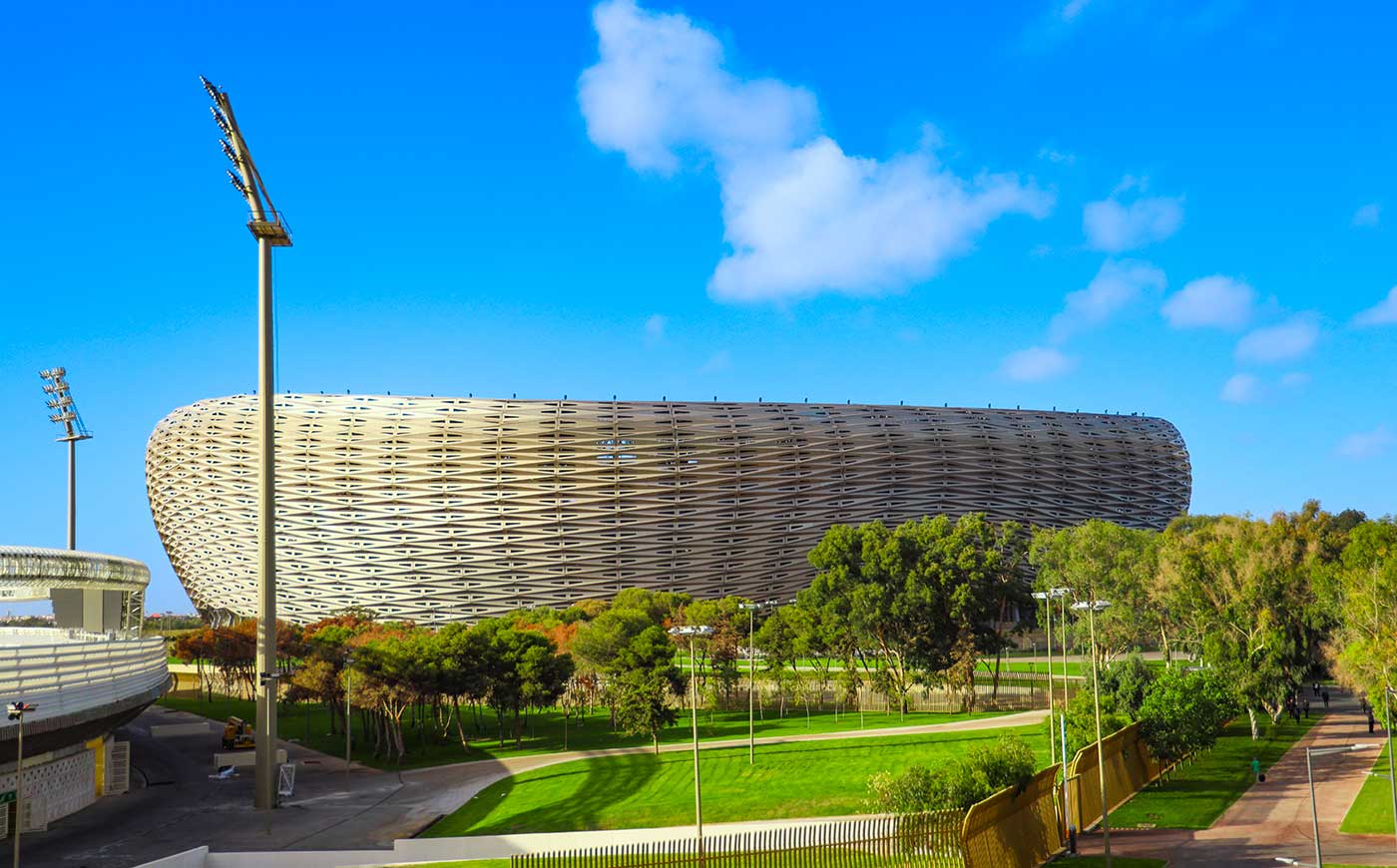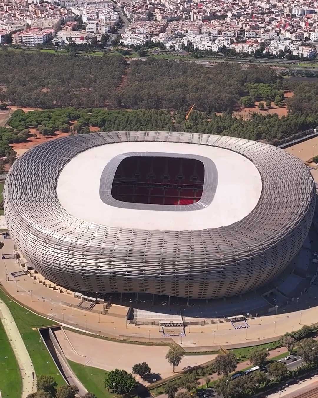 Progettato da Populous, lo stadio – che riqualifica interamente quello originale costruito nel 1983 per i Giochi del Mediterraneo – ha una capienza di 68.700 posti e si distingue per il design parametrico della facciata, composta da 19.200 triangoli di alluminio color champagne, ciascuno unico nelle dimensioni, ispirati alle palme che si allineano lungo i grandi viali di Rabat e all’artigianato tessile locale.