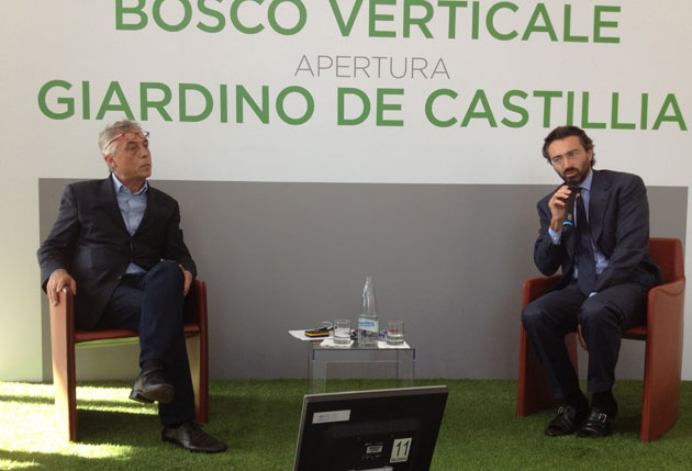 | Stefano Boeri e Manfredi Catella, a.d. di Hines Italia, durante la presentazione alla stampa ieri, nella lounge della torre De Castilia di Bosco Verticale |