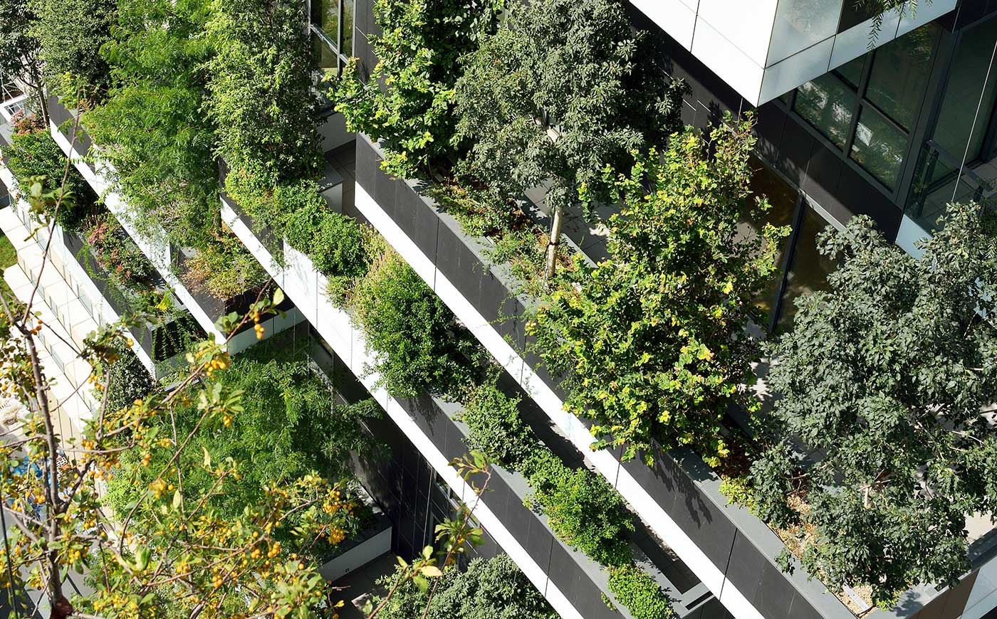 Alte 80 e 112 metri, le due torri – che complessivamente sviluppano una superficie abitabile di 22mila mq per un totale di 113 appartamenti – accolgono in verticale e nel centro della città l’equivalente di 2 ettari di bosco: 480 alberi di grande e media altezza, 300 alberi di piccole dimensioni, 5.000 arbusti e 11mila tra perenni e tappezzanti. Il sistema vegetale, gestito con un sistema di irrigazione automatizzato centrale e per il quale è prevista una regolare manutenzione, fa parte a tutti gli effetti dell’involucro degli edifici e ne è parte condominiale comune.
