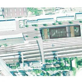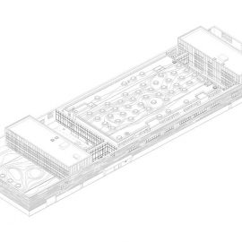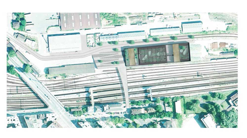 Il progetto di Scape Architettura si compone di un’infrastruttura logistica caratterizzata da una forte componente tecnica, a ridosso dei fasci di binari ma collocata al centro del tessuto urbano, concepita come un campus.