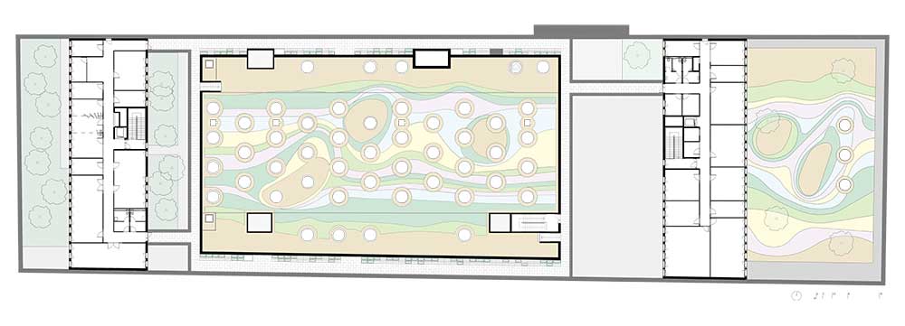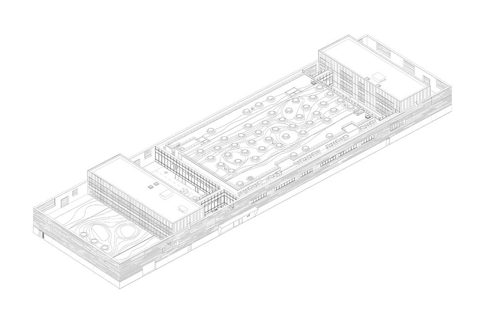 E così il centro di controllo ferroviario è un edificio chiuso, definito da un alto muro di cinta in pietra che segue l’intero perimetro del lotto; al suo interno, il complesso è costituito da una sequenza di patii, di aree logistiche, di giardini pensili, di uffici e di grandi ambienti destinati al controllo ferroviario.