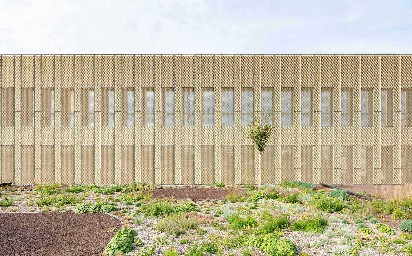 Due edifici coperti con una maglia metallica dorata emergono dallo scuro muro in pietra di scisto. Gli spazi di lavoro godono di viste sull’esterno e di luce naturale. Per garantire il maggior comfort, Scape ha immaginato un sistema costruttivo che combina l’illuminazione artificiale a quella naturale per le zone attive giorno e notte.