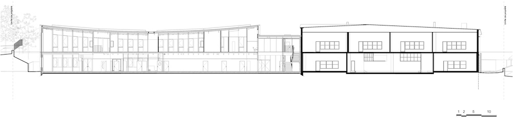 I due nuovi volumi e l’edificio della scuola elementare esistente sono collegati da due passaggi luminosi con corridoi a doppia altezza: il primo, all’incrocio con la struttura esistente, funge da sala della scuola elementare, mentre il secondo, che unisce la sala dell’asilo e l’area giochi coperta, porta abbondante luce naturale sulla strada interna.