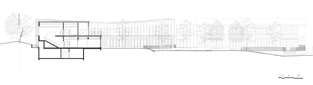L’edificio, in legno e vetro, riflette il fogliame degli alberi, mentre la disposizione spaziale enfatizza la trasparenza tra i volumi dell’edificio e l’apertura verso il cielo.