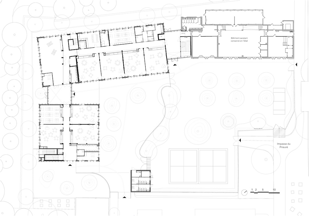 La scuola materna è tutta al piano terra, con le aule che offrono accesso diretto al cortile. Sia nel vecchio sia nel nuovo cortile, le aree aperte intorno agli alberi esistenti sono state ampliate.