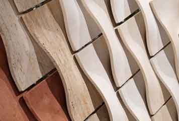 Il concept dell’installazione si basa su un sistema di pannelli ondulati in pietra che riprendono la texture del vimini intrecciato. Sessantanove vele di marmo sono appese a un’anima portante in metallo alta cinque metri e disposta a ventaglio. In contrapposizione alla leggerezza delle vele, la pavimentazione è formata da lastre dalla superficie volutamente grezza che evoca l’aspetto del materiale lapideo allo stato naturale.