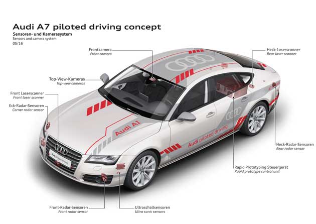 Il cuore del prototipo Audi è la centralina di controllo dei sistemi di guida zFAS. I suoi processori sono in grado di valutare in tempo reale i segnali raccolti dai sensori (laser scanner, telecamere, radar e sensori ultrasonici) di cui è dotata la vettura ed elaborare un modello dettagliato dell’ambiente circostante per “anticiparne” la dinamica e assumere le appropriate decisioni.