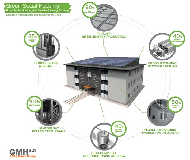 Il modulo – denominato Gmh 4.0 (Green module home) – prevede strutture in acciaio reticolare, materiali di isolamento ecosostenibili e sistemi energetici intelligenti (IoT) per ridurre i costi di costruzione (la stima dei promotori è del 30% in meno rispetto agli standard attuali), i tempi di realizzazione (- 70%) e i consumi energetici e, di conseguenza, le emissioni in atmosfera di CO2 (- 50%). Un progetto di edilizia, insomma, a energia quasi zero (edifici Nzeb), con garanzie di performance energetiche di lungo termine (30 anni), rapida realizzazione e costi quasi dimezzati rispetto a quelli del mercato edilizio tradizionale.