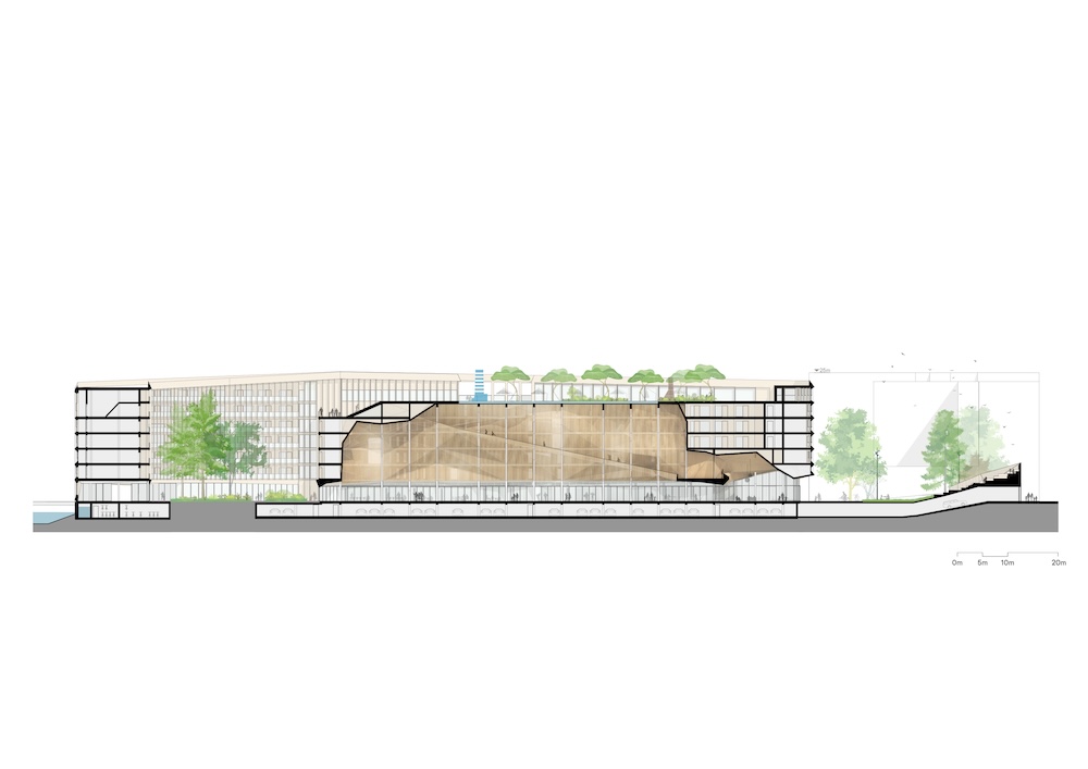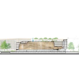 Nella parte anteriore dell’edificio un piazzale pubblico è delimitato da un padiglione in legno con gradini, che funge da parco giochi tridimensionale. Il padiglione segna anche l’ingresso al parcheggio e può essere utilizzato come tribuna per proiezioni di film o eventi all’aperto.