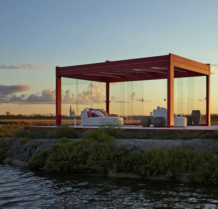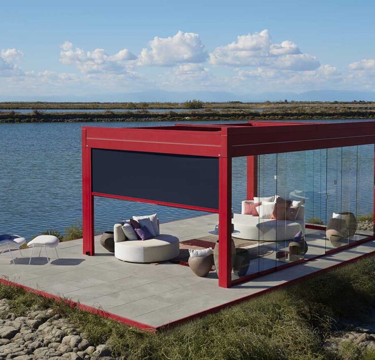 Sopra l’edificio, la pergola Kedry Prime definisce uno spazio lounge protetto da pareti vetrate scorrevoli a tutta altezza.
