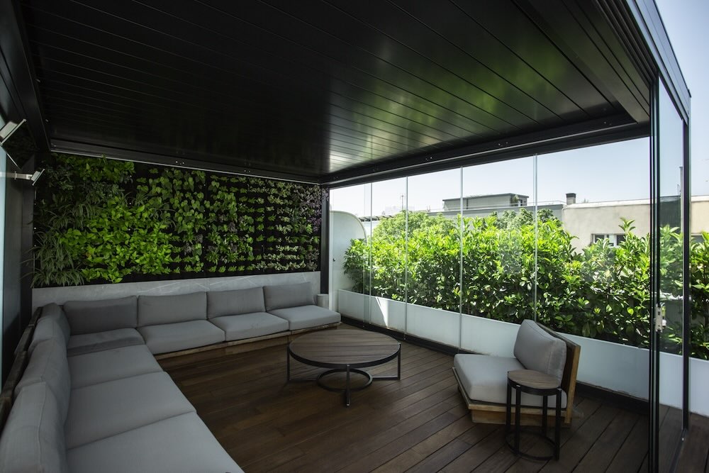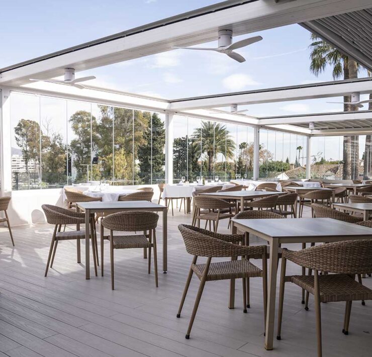 Entrambe le strutture – caratterizzate da un’estetica minimale e da una finitura nero opaco a contrasto con la facciata bianca – sono accessoriate con illuminazione a LED perimetrale dimmerabile e vetrate scorrevoli Line Glass. Queste ultime, completamente prive di profili perimetrali, assicurano un effetto tutto vetro e massima trasparenza, migliorando la fruizione degli spazi in ogni condizione climatica e favorendo il dialogo tra interno ed esterno.