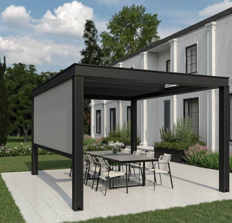 La pergola bioclimatica Kedry Skylife crea una zona living all’aperto accanto alla piscina, con lame mobili e illuminazione a LED perimetrale integrata.