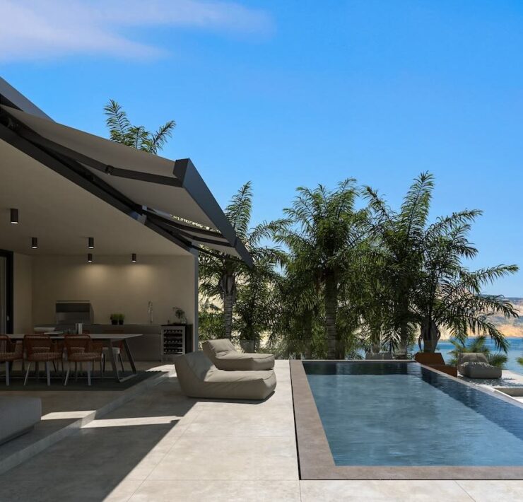 Fulcro dell’intervento sono due pergole bioclimatiche firmate KE: Kedry Skylife, installata in prossimità della piscina (24 mq), e Kedry Prime, posizionata sul rooftop (16 mq). La prima è dotata di un sistema di lame impacchettabili e motorizzate, che ruotano e scorrono per modulare luce e ventilazione, mentre la seconda presenta un tetto a lame orientabili fino a 135°, ideale per coprire superfici importanti e garantire protezione e aerazione naturale.