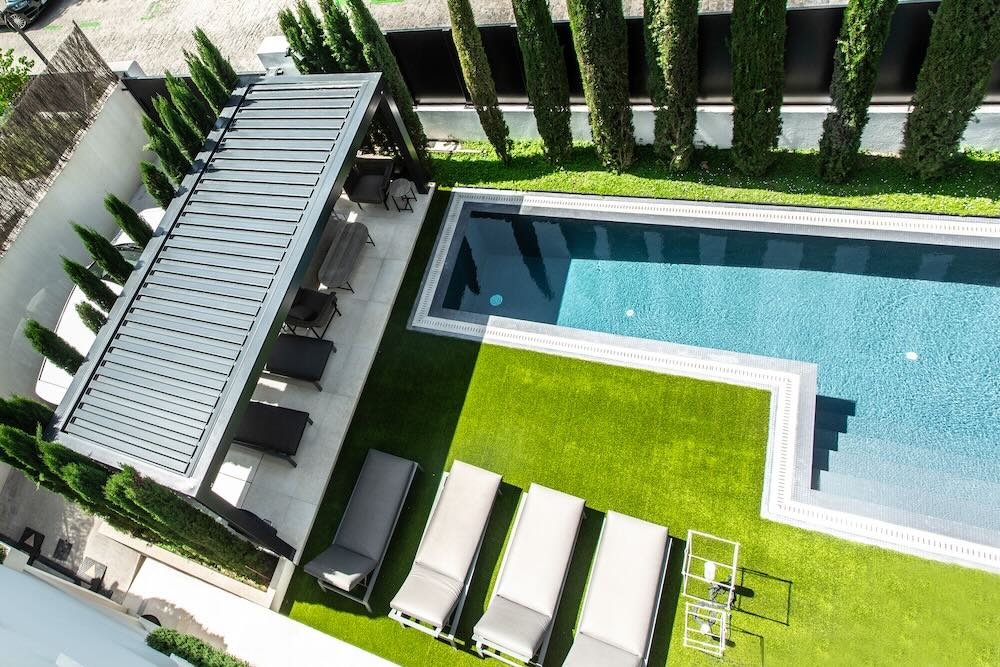 Vista zenitale sulla piscina e sul sistema di copertura della pergola Kedry Skylife.