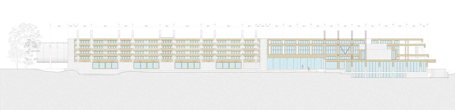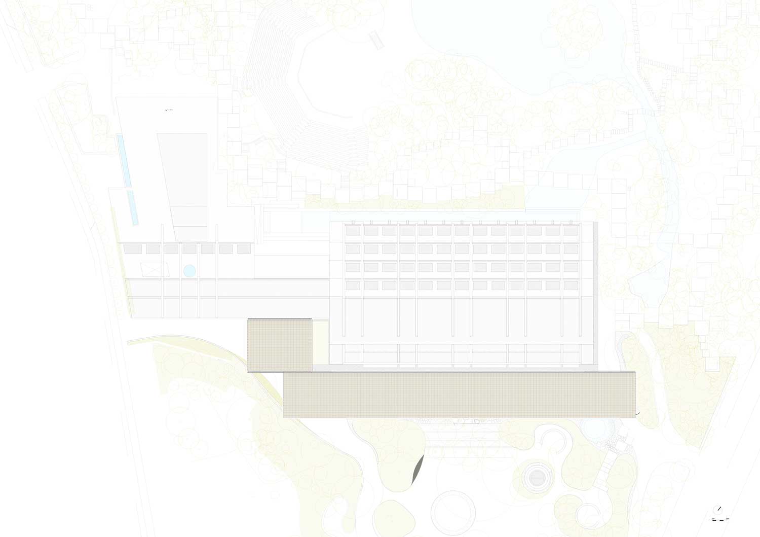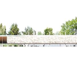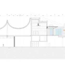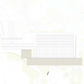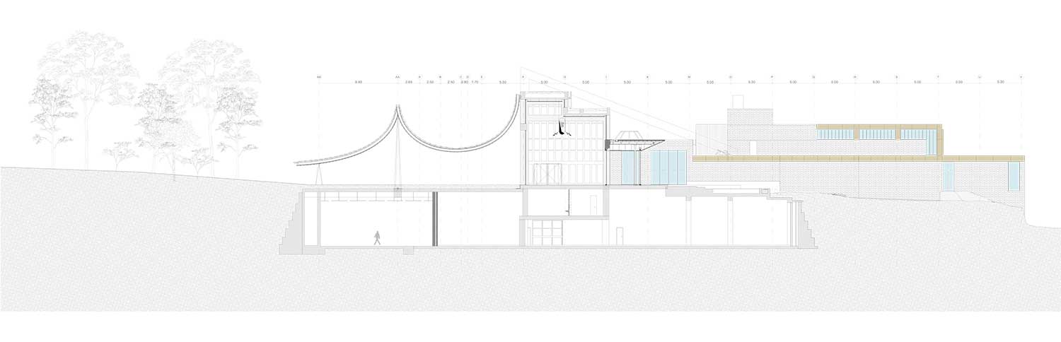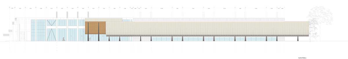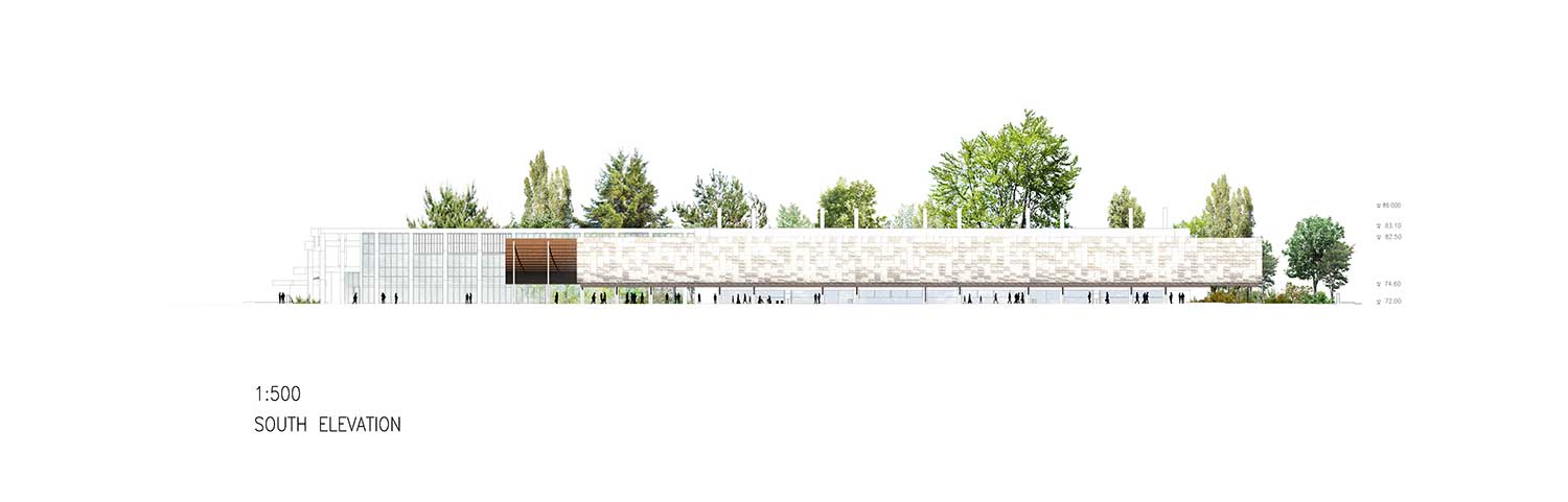 Caratterizzato da due coperture esterne, la prima delle quali è lunga circa 100 metri e profonda 15, ispirate alle spioventi engawa delle abitazioni giapponesi, l’intervento di Kengo Kuma dà vita in primo luogo a un ambiente esterno protetto dove si possono svolgere incontri e conferenze.