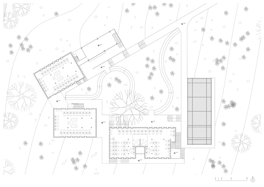 Il campus è costruito in pietra di cava di provenienza locale con una finitura in gesso. Nella scelta dei materiali e delle tecniche di costruzione, Kéré Architecture ha soppesato i fattori di sostenibilità ecologica, costo e disponibilità per arrivare al miglior compromesso. La collaborazione con la comunità locale è stata fondamentale in questo processo, attingendo alla loro esperienza e competenza.
