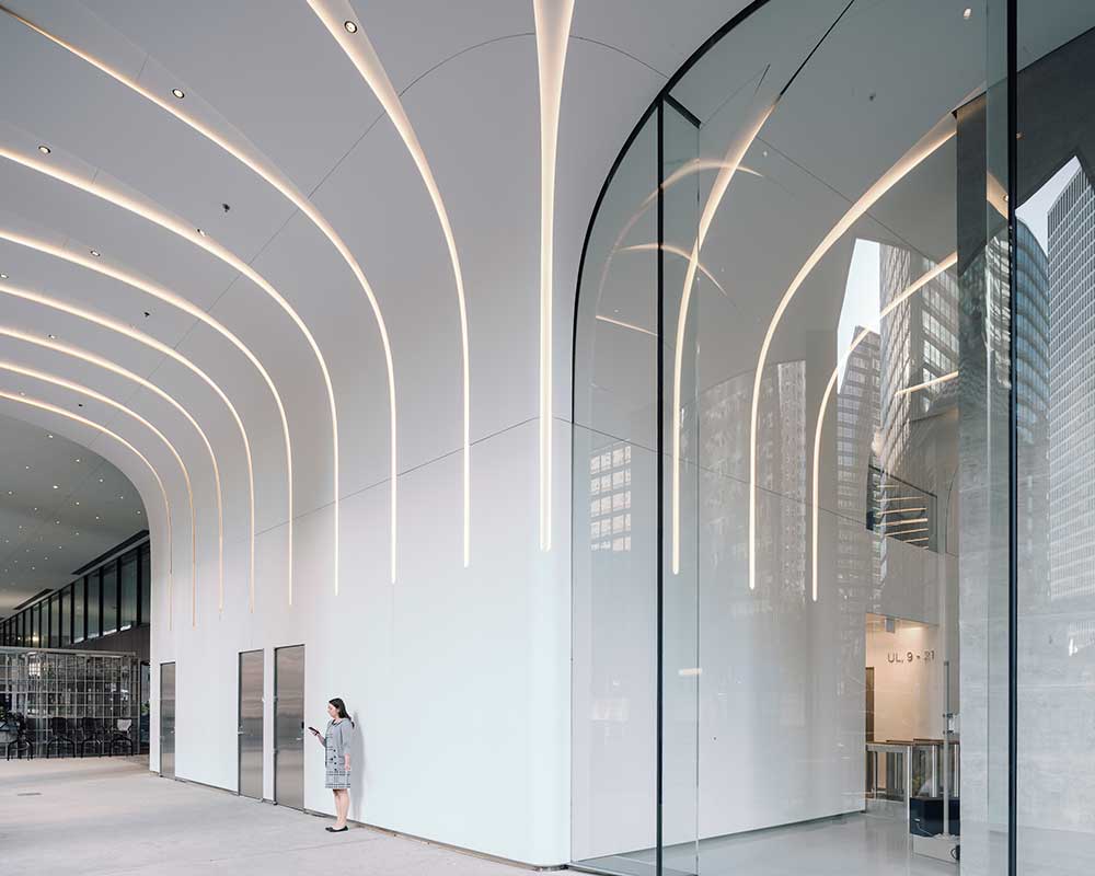 Per questo lo studio Krueck + Sexton di Chicago, chiamato a progettare un nuovo atrio, luminoso e unificante, con spazi informali, flessibili, funzionali e confortevoli, ha concepito una sinuosa facciata curva in vetro, il cui perimetro scorre, estendendosi verso il fiume su cui si affaccia, intorno ai pilastri dell’edificio, generando un andamento a serpentina dello spazio interno, rivestito in pannelli curvi di Krion® di colore bianco Snow White.