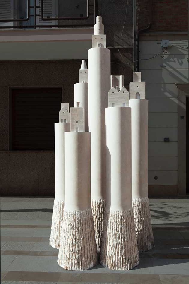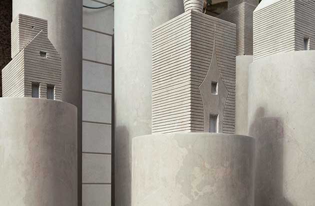 La base scalpellata delle grandi colonne allude alla fase di estrazione della pietra dalla cava, mentre la parte alta levigata fa riferimento e vengono poi levigate nella parte superiore alla capacità di trasformazione del materiale grazie al lavoro degli artigiani. Sulla loro sommità poggiano micro-architetture a disegnare un paesaggio.