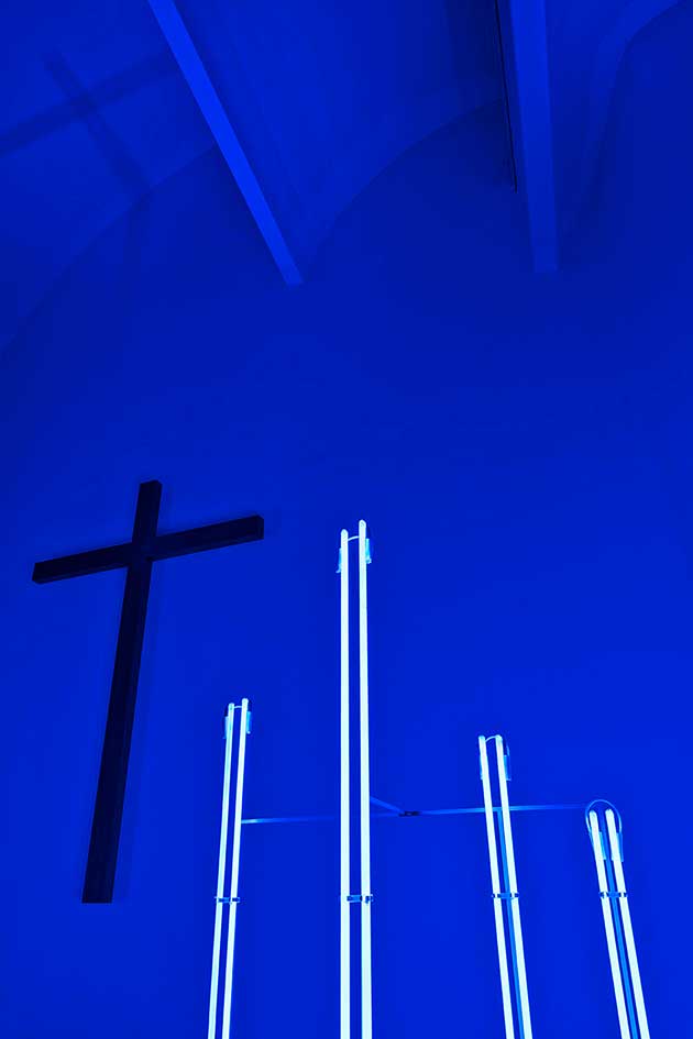 Il presbiterio, inoltre, sarà illuminato da 12 segmenti di neon blu, posizionati in maniera dinamica e ascensionale come ulteriore richiamo agli apostoli. Il tutto sarà avvolto dall’ulteriore luce blu emanata da una videoproiezione che si protenderà sino al grande crocefisso in legno voluto da Aalto, che sarà per l’occasione fiancheggiato da due croci di vetro argentato poste ai lati dell’altare. Nella zona del battistero, posizionato da Aalto sul lato destro della navata centrale all’altezza dell’abside e prospettante sul Reno,sarà infine proiettato un video sul tema dell’acqua, in cui il fluire delle immagini seguirà il senso della corrente del fiume».