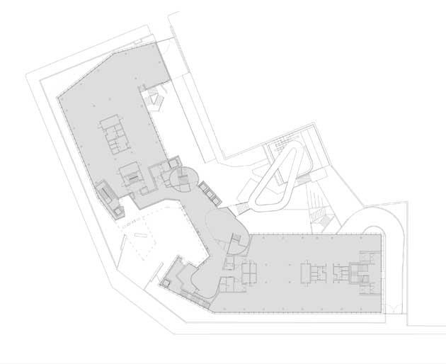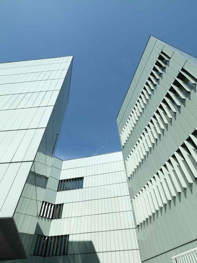 Leggermente staccato dal fronte stradale da una piccola superficie a verde, il volume compatto, filtrato da un involucro tecnologico a doppia membrana vetrata che può rimanere muto e chiuso (lasciando comunque entrare la luce all’interno), o dialogare con l’intorno schierando le lamelle in vetro serigrafato della prima pelle in funzione di brise- soleil, porta ordine nel linguaggio architettonico affastellato e confuso dell’isolato.
