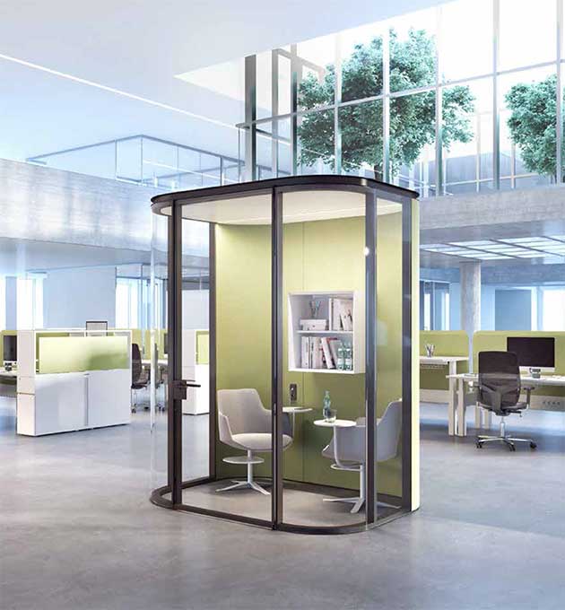 Prodotti come Phone Booth e Collaborative Room, luoghi insonorizzati di piccole dimensioni che facilitano le conversazioni private, sono il risultato dell’attenzione verso il comfort negli ambienti open space e della ricerca di soluzioni equilibrate tra spazi aperti, chiusi e flessibili multifunzione, anche con soluzioni capaci di accogliere fino a 15-20 persone per riunioni, eventi di formazione o meeting.