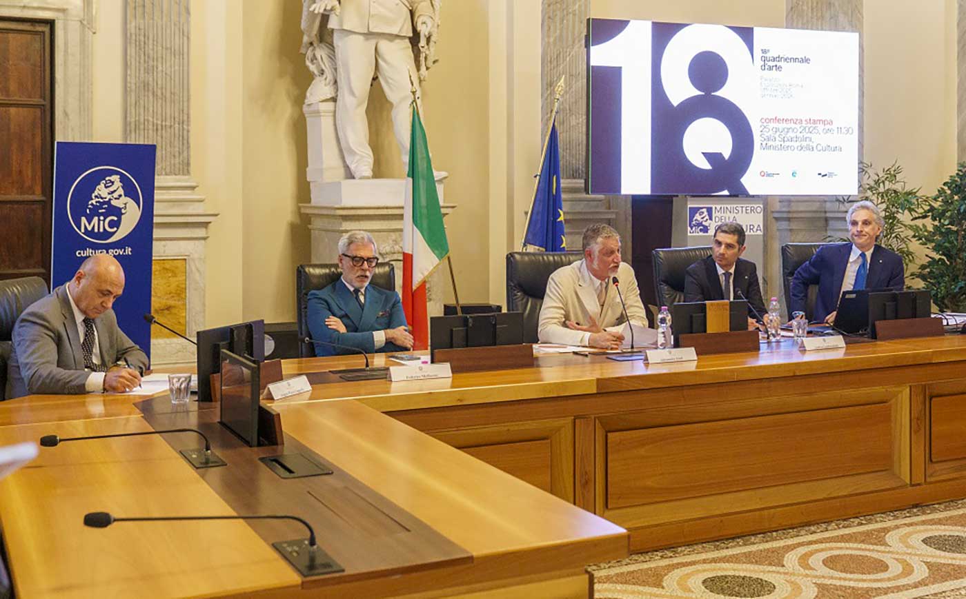 Alla conferenza stampa del 25 giugno hanno preso parte il ministro della Cultura Alessandro Giuli, Angelo Piero Cappello, direttore generale Creatività Contemporanea – Ministero della Cultura, Federico Mollicone, presidente della Commissione Cultura della Camera dei Deputati, il presidente della Fondazione La Quadriennale di Roma Andrea Lombardinilo e Michele Coppola, executive director Arte, Cultura e Beni Storici di Intesa Sanpaolo e direttore generale delle Gallerie d’Italia.