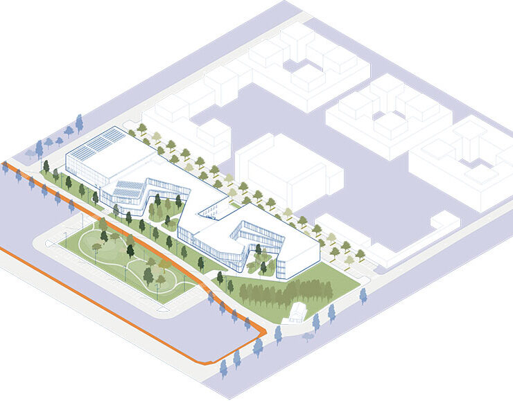 La rotazione dei volumi dei blocchi genera alcuni terrazzi con copertura verde che riducono l’impronta ambientale della nuova realizzazione e costituiscono anche un ulteriore spazio educativo per gli studenti.