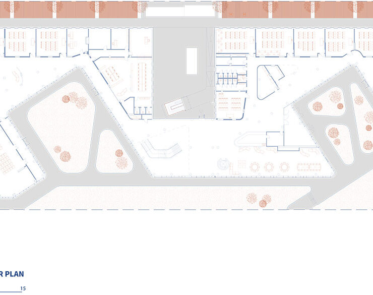 Il piano terra è uno spazio aperto alla cittadinanza, articolato in un auditorium, una caffetteria, una biblioteca, oltre a uffici e laboratori: prendendo a riferimento le community school di matrice europea, sono stati progettati interni improntati a creatività, imprenditorialità e cooperazione tra studenti e insegnanti; gli spazi distributivi fluidi e flessibili incoraggiano le relazioni informali e un nuovo genere di approccio educativo.
