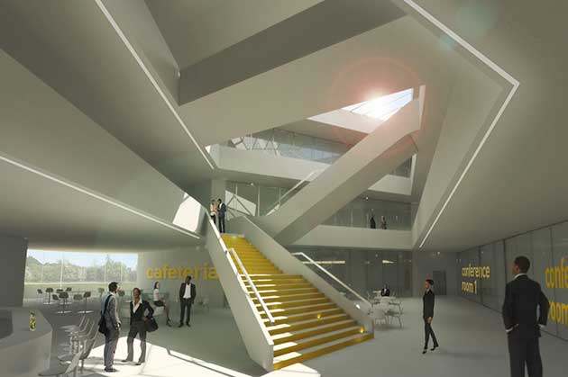 Internamente l’edificio è caratterizzato da un grande spazio centrale aperto su tre livelli che funge da collegamento verticale grazie alla scala e al sistema di ballatoi che si incrociano ai diversi piani. Il grande volume è un luogo dinamico e rappresenta il contesto ideale per le attività di apprendimento innovative, punto di partenza delle università del futuro. Grandi spazi dedicati agli hub, distribuiti in continuità lungo i ballatoi, rappresentano luoghi adatti ad accrescere l’apprendimento e la condivisione delle conoscenze, utili allo sviluppo dei rapporti tra gli studenti universitari e le imprese che saranno coinvolte nei programmi.