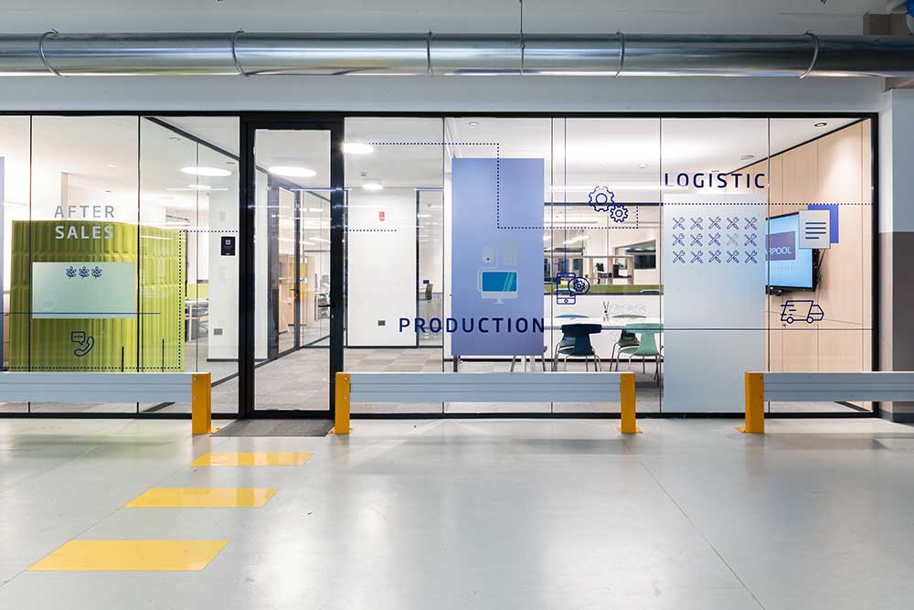 I parapetti in cemento sono stati sostituiti con altri in vetro che lasciano percepire l’attività che si svolge all’interno di una azienda fatta soprattutto di persone.