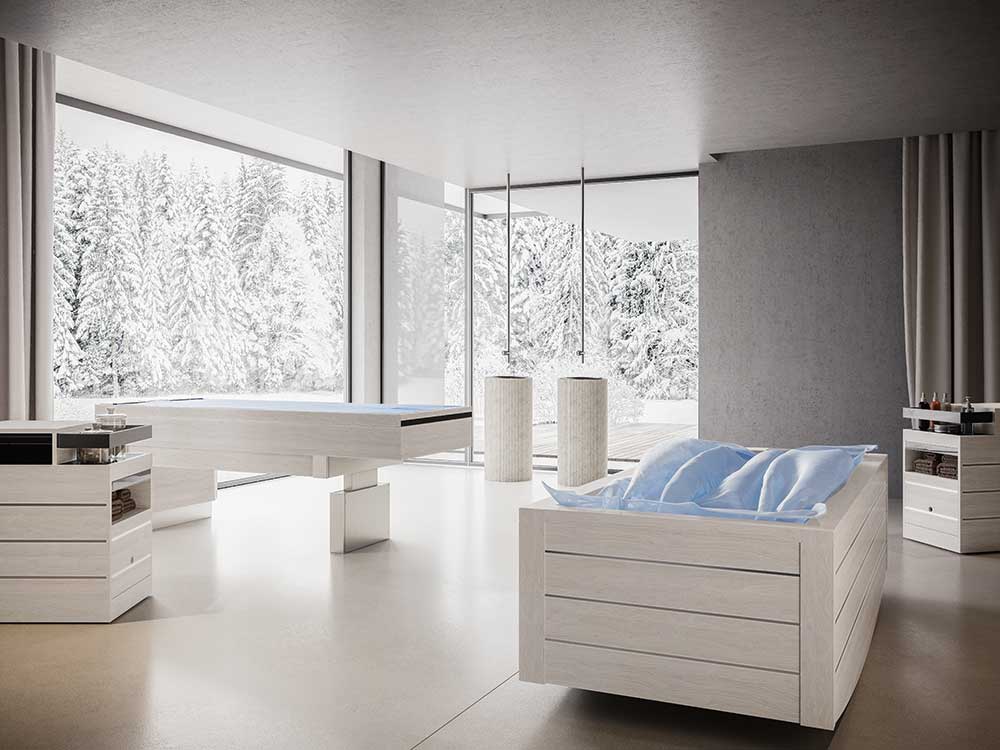 Nel completo comfort del calore omogeneo e costante, massaggiato dagli idrogetti, cullato dai colori che più ama, l’ospite vive un viaggio di recupero dallo stress e dall’ansia.