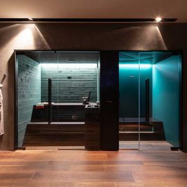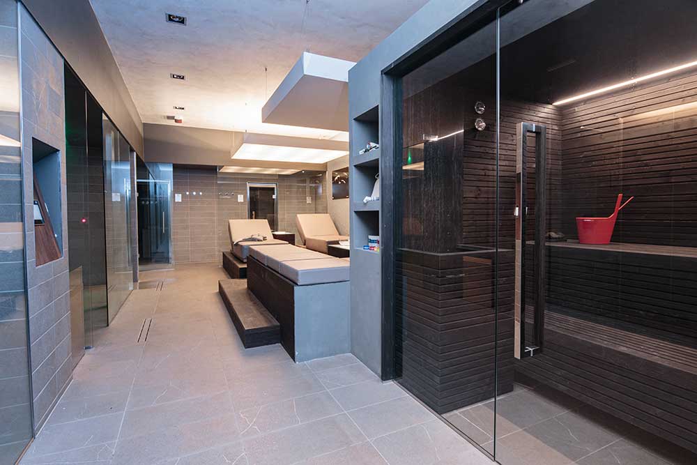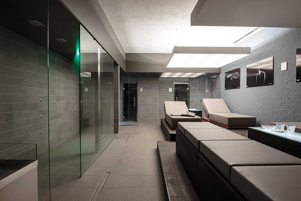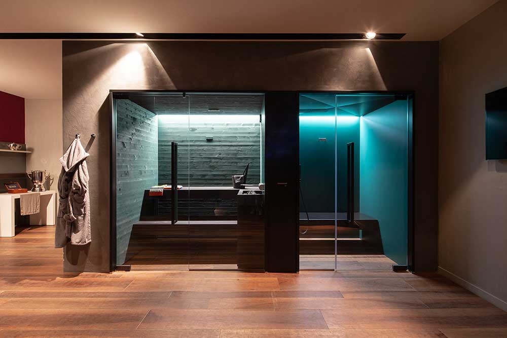 Tutti i dettagli e gli accessori (la panca, la rubinetteria dello steam e il copristufa della sauna) presentano una finitura nera opaca che sottolinea, per contrasto, il valore cromatico dei due ambienti wellness.