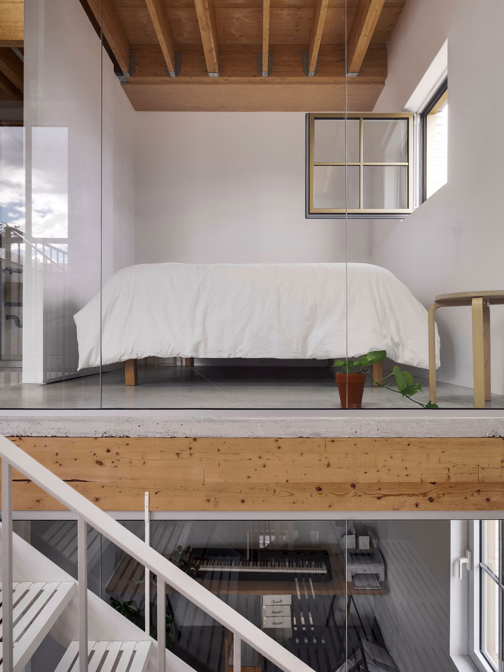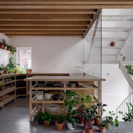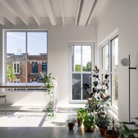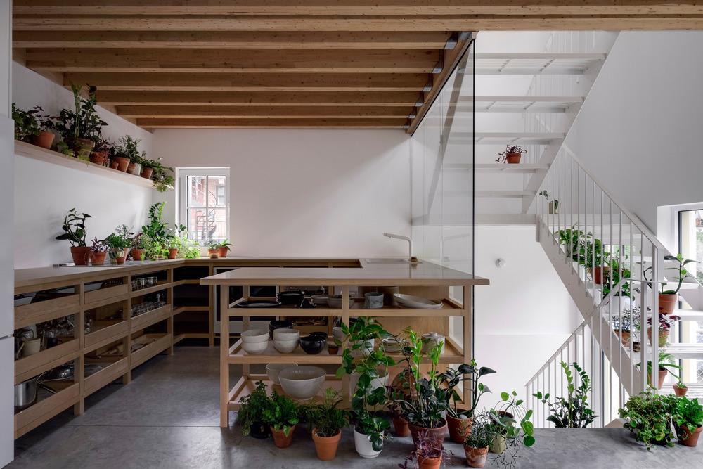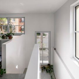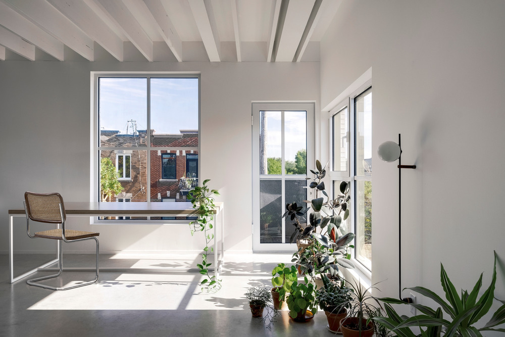 Jean Verville, con i proprietari dell’edificio, ha assemblato tre appartamenti distribuiti su quattro piani che insistono su un’area di 90 metri quadrati. Il laboratorio di ceramica del padrone di casa di 63 metri quadrati, con un piccolo giardino e una stanza da letto, si dispone su due piani; l’abitazione principale di 197 metri quadrati (e oltre 100 di giardino) si inerpica su tutti i quattro piani dell’edificio; infine, ‘l’appartamento terrazza’ occupa una porzione di tre livelli per una superficie totale di 104 metri quadrati (e 37 di giardino).