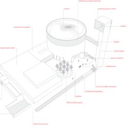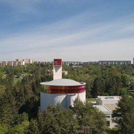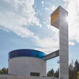 La purezza delle forme va nella direzione di aiutare i fedeli e i residenti a identificare uno spazio pubblico aperto a tutti. In particolare, la pianta circolare della chiesa rappresenta un simbolo antico del cielo e dell’eternità. Il cielo si riflette nella finestra colorata che abbraccia la chiesa appena sotto il tetto. Il cerchio è la forma della pienezza, è il punto fermo nell’area del quartiere residenziale e il suo centro spirituale.