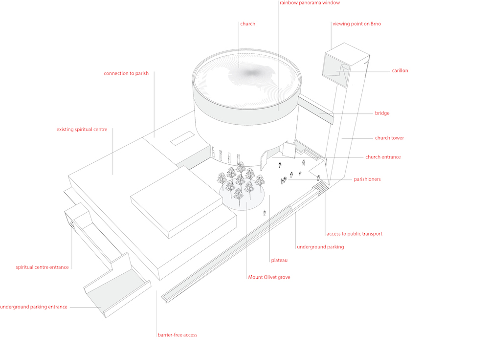 Sul pianoro rettangolare si trovano tre edifici religiosi: oltre la chiesa, la torre e il centro civico progettato da Zdeněk Bureš. A ciascun volume viene attribuita una forma specifica in pianta: il cerchio per la chiesa, il triangolo per la torre, il rettangolo per il centro civico già esistente.