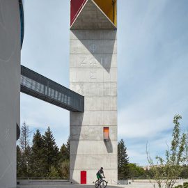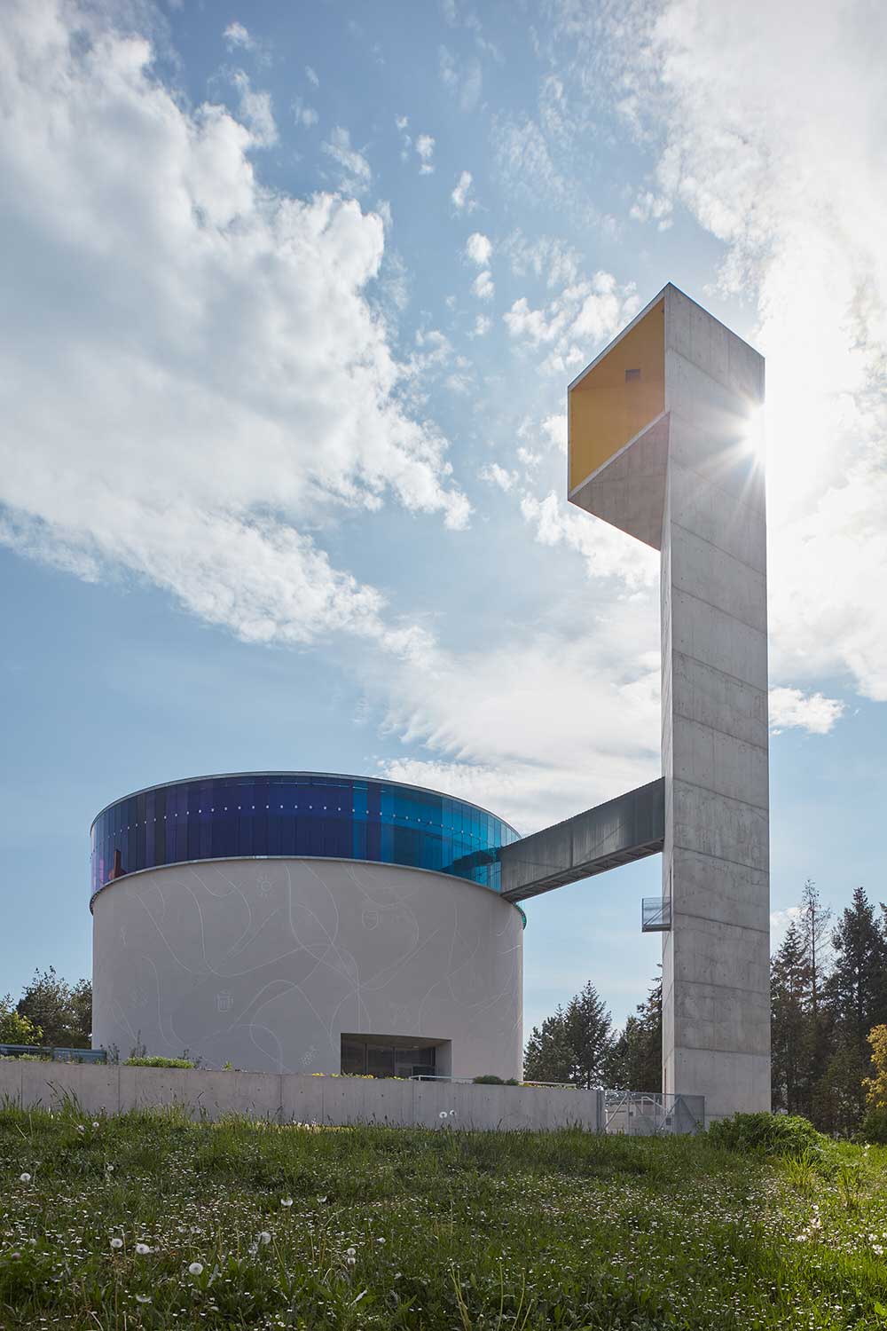 Alla sommità la torre si piega ad angolo retto verso la chiesa. Una scala a chiocciola in acciaio passa attraverso la torre che, guardando dall’alto, ricorda lo schema dei colori e la forma della cupola dell’edificio principale.