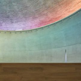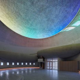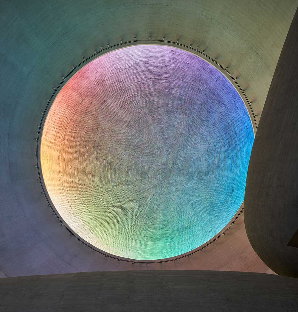 Le linee morbide della struttura formano uno spazio disincarnato, plasmato dalla luce proveniente dalla finestra soprastante lunga 80 metri, che ricorda Your rainbow panorama di Olafur Eliasson. Una luce molteplice, di tutte le tinte dell’arcobaleno, si diffonde nella sala e si irradia sulle superfici di cemento armato a vista.